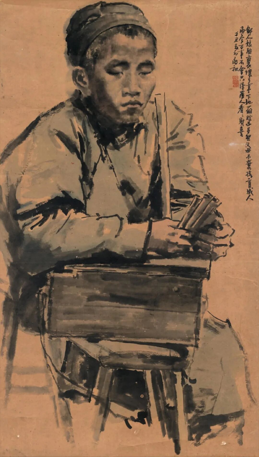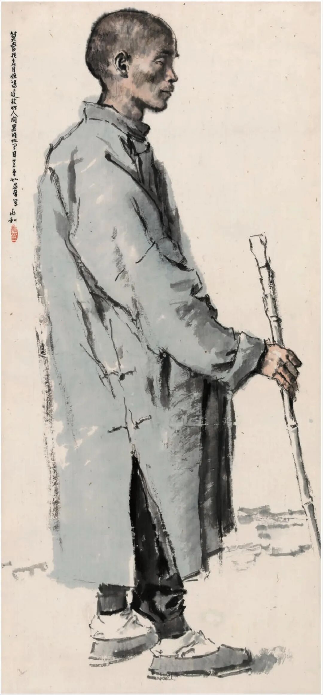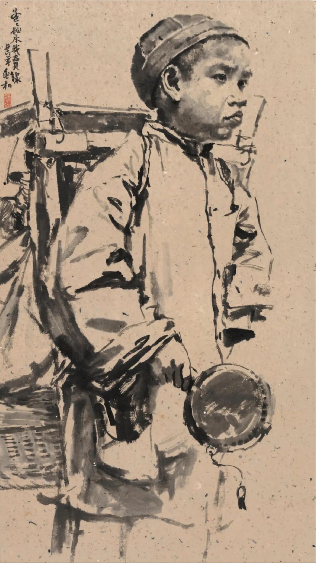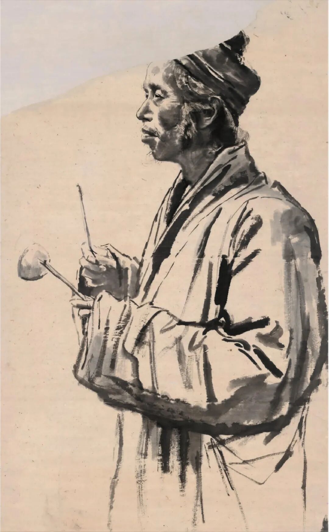 蒋兆和这一时期的创作核心是以“为民写真”的现实主义精神,开创了中西融合的现代水墨人物画新路。他以中国画的纸、笔、墨结合西画的素描与造型技巧,创造性地将山水画中的“皴擦”技法用于人物面部和衣纹描绘,同时,结合素描的明暗关系来表现体积和结构,达到了拙涩老辣、精微传神的艺术效果,具有极强的艺术感染力。