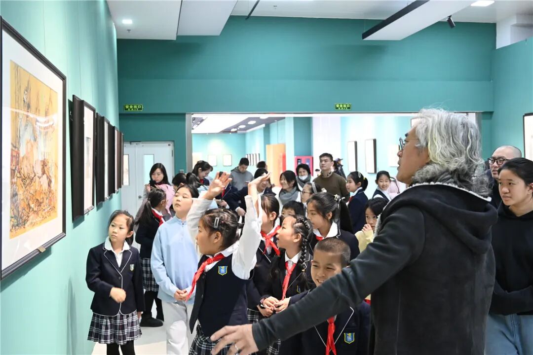尽管天气寒冷,但孩子们脸上满是对艺术盛宴的期待。在中国国家画院人物画所专职画家、本次展览策展人孙震生的导览下,孩子们先后参观了中国国家画院美术馆东楼一层、三层展区,150余位艺术家的330余件作品以“西学东渐”“绘事后素”“多元共融”三大主题徐徐展开。观展过程中,孙震生为孩子们详细介绍了作品背后的时代背景与艺术故事,细致解读了不同历史时期素描作品的艺术风格、表现手法及创作理念。从近代以来反映社会变迁的写实佳作,到当代艺术家融入创新思维的探索之作,一幅幅兼具思想性与艺术性的素描作品,依次映入眼帘。孩子们一边认真聆听讲解,一边不时驻足凝视。