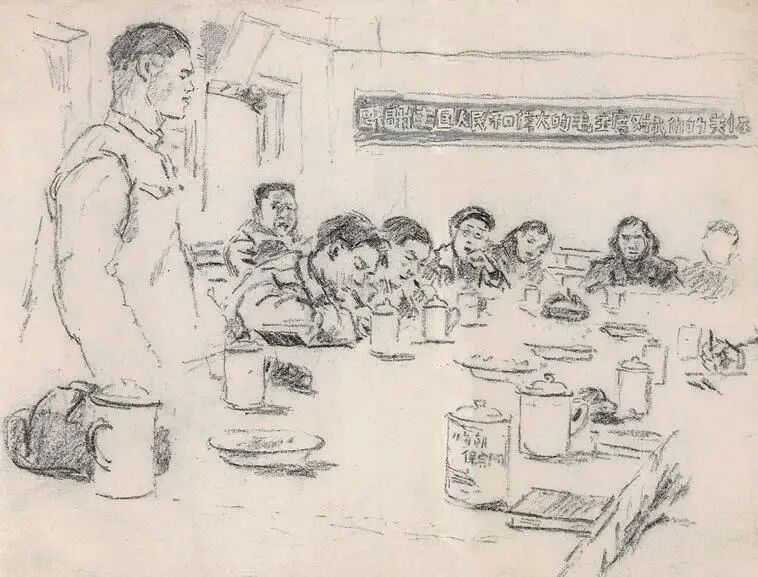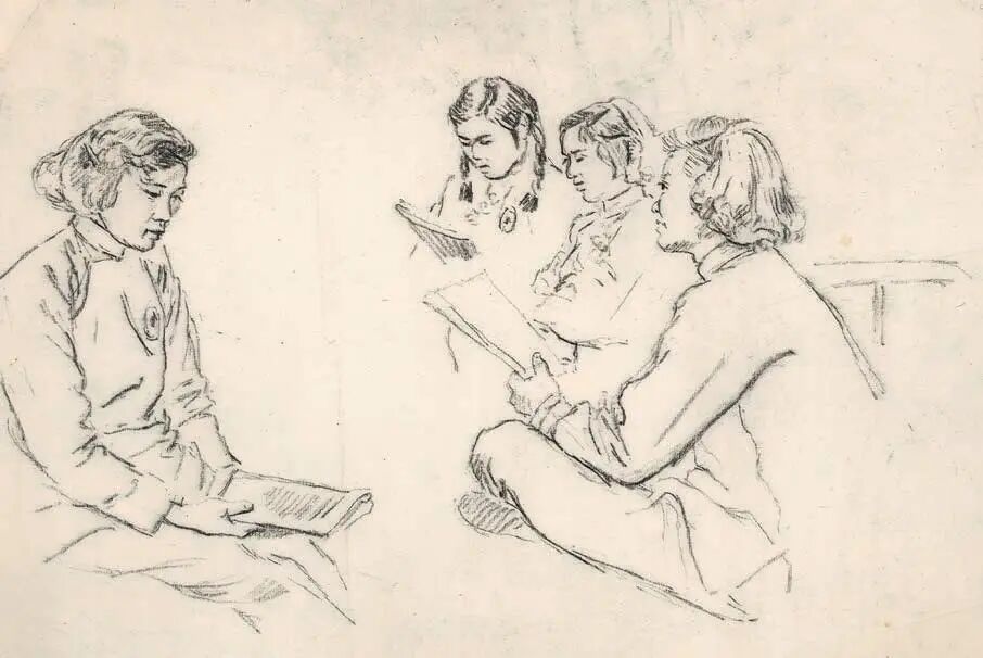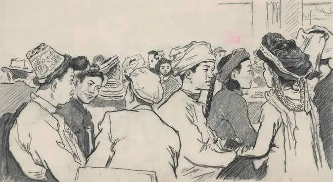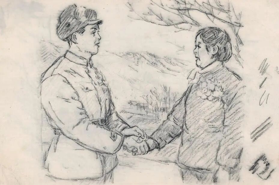 河北省工业劳动模范韩桂花和志愿军英雄会见速写 1956 年 铅笔 纸本 21.8cm×32.7cm