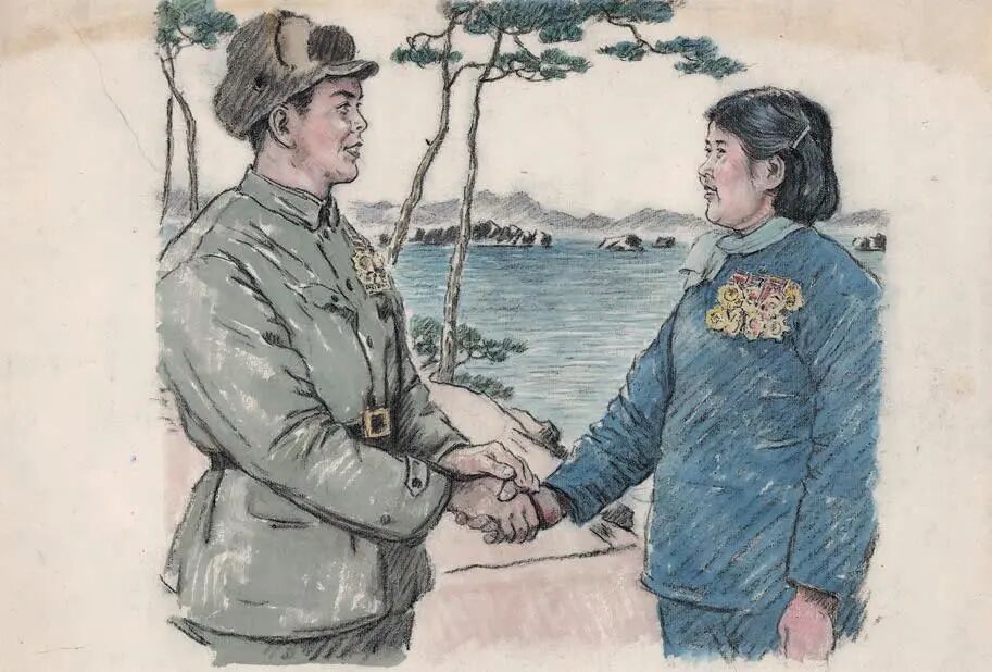 河北省工业劳动模范韩桂花和志愿军英雄会见 1956 年 水墨设色 纸本 21.8cm×32.3cm