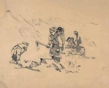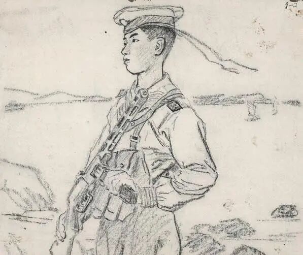 时刻警惕着的中国人民志愿军战士 1956年 水墨 纸本 21.7cm×26.2cm