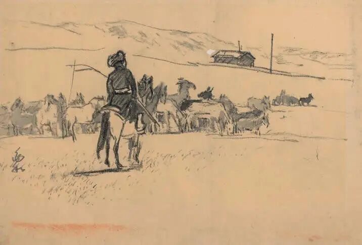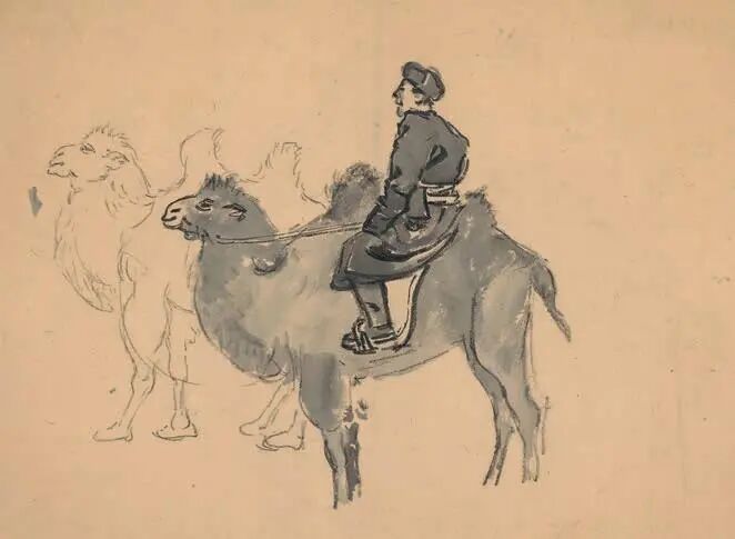 塞上写生·骆驼与牧民 1958年 铅笔 纸本 21.7cm×29.6cm 私人收藏