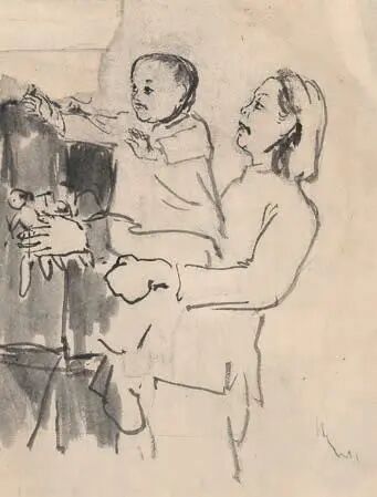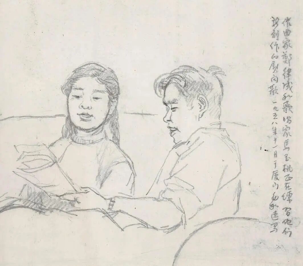 福建前线速写·郑律成和马玉桃 1958年 铅笔 纸本 21.1cm×24cm