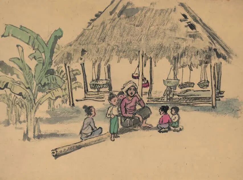 临时托儿所 1963年 水墨设色 纸本 23.7cm×31.9cm