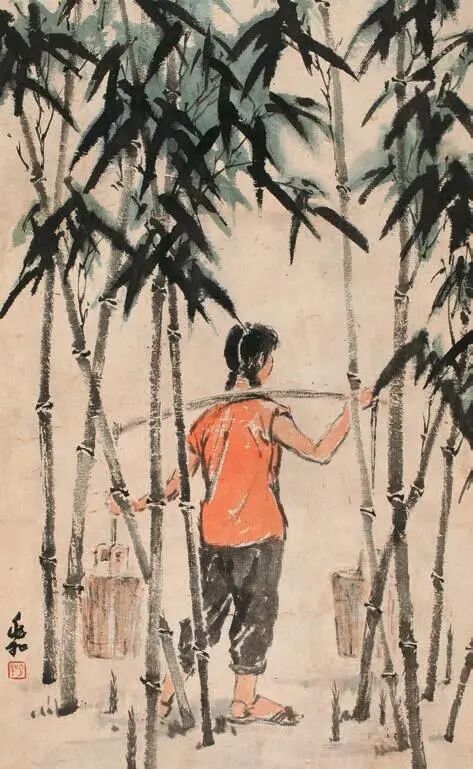 挑水少女写生 20世纪5060年代 水墨设色 纸本 64.5cm×40cm