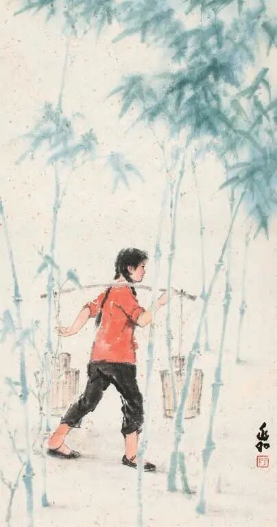 挑水少女写生 20世纪5060年代 水墨设色 纸本 66.7cm×35.4cm