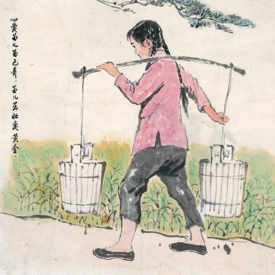 挑水少女写生 20世纪5060年代 水墨设色 纸本 31cm×31cm