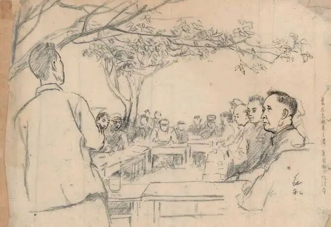 塞上写生·农民老师来主讲,果园树下作课堂 1958年 铅笔 纸本19.5cm×28.4cm