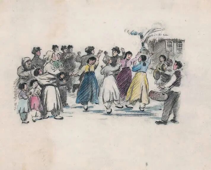 朝鲜人民和志愿军在一起联欢 1956年 水墨设色 纸本 21.8cm×32.2cm