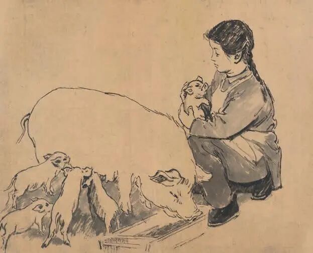 四季青人民公社速写·养猪姑娘 1959年 水墨设色 纸本 24.5cm×30.2cm